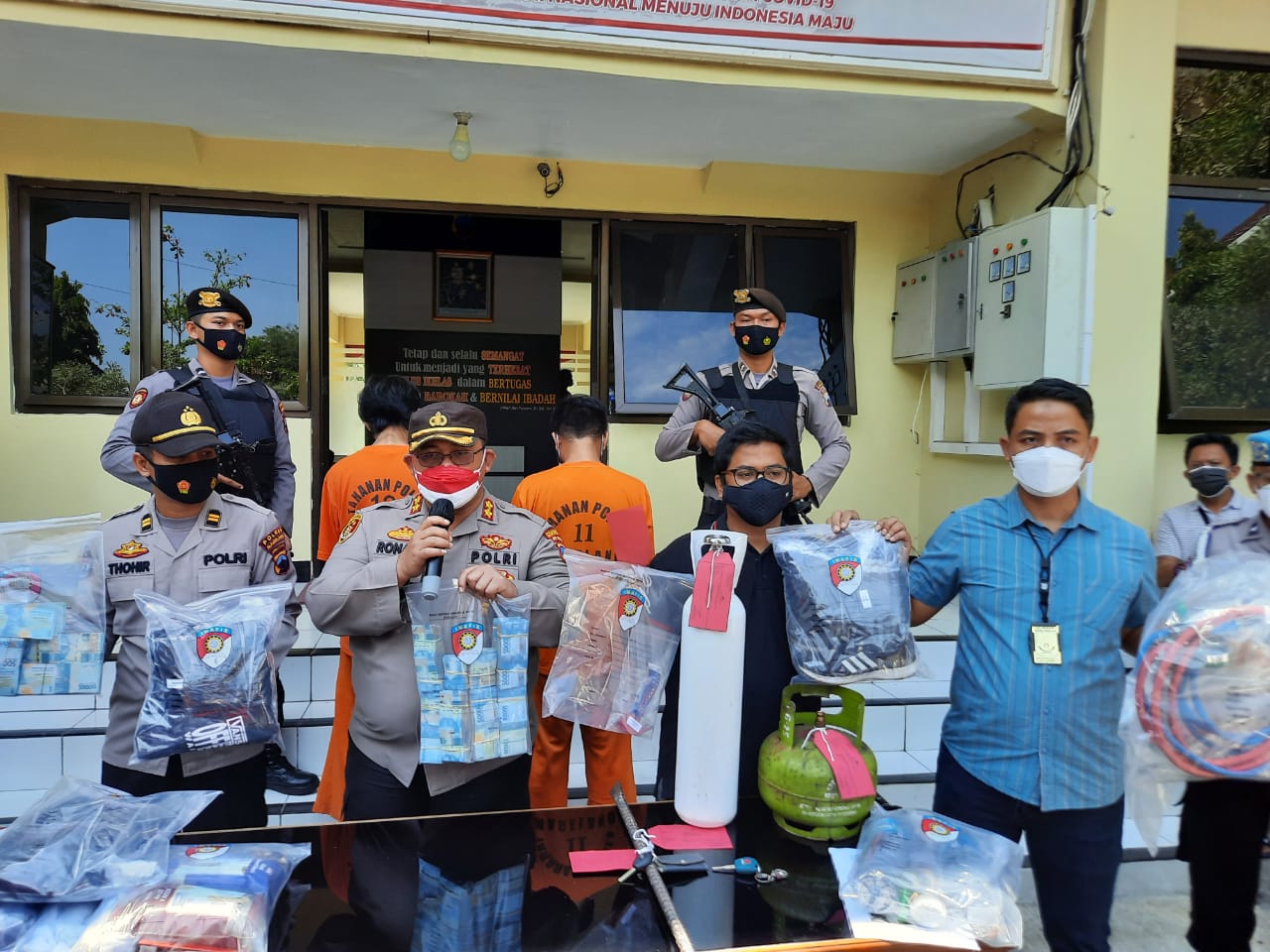 Kapolres juga menambahkan, adapun barang bukti yang berhasil disita petugas, 1 unit Mobil BMW 318i (dibeli dari uang hasil curian), Uang Tunai Rp 113 Juta dengan pecahan Rp 50 Ribu, 1 unit Mobil Suzuki Ertiga yang dijadikan sarana, 1 buah LPG 3 Kg, 1 set alat las, 1 buah gunting,1 buah linggis, 1 buah senter, 1 buah korek api gas, 1 buah obeng, Handphone milik Tersangka, 1 kaleng Pilox warna hitam Pakaian Tersangka , 1 buah martil dan beberapa buah pakaian