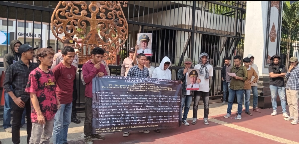 JAKARTA |Matalensanews.com–Manifesto Pejuang Rakyat Maluku Utara (MAPERA MALUT) menggelar aksi demonstrasi didepan Kementrian Dalam Negeri terkait beberapa kebijakan Pj. Bupati Halmahera Tengah yang dinilai kontrofersi dan melanggar peraturan. Jum'at, 22 September 2023.