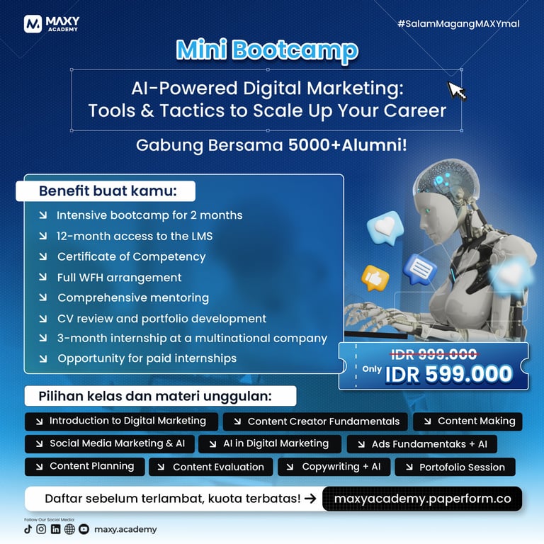Untuk informasi lebih lanjut tentang Digital Marketing + AI Bootcamp, kunjungi situs resmi Maxy Academy.