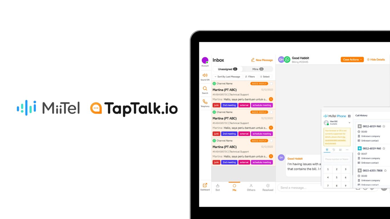 MiiTel, sistem telepon VoIP dengan AI Analitik, kini dapat diintegrasikan dengan OneTalk, platform omnichannel dari TapTalk.io. Integrasi ini menghadirkan solusi komunikasi pelanggan yang lebih efisien, dengan menggabungkan fitur telepon dan chat dalam satu dashboard terpusat.